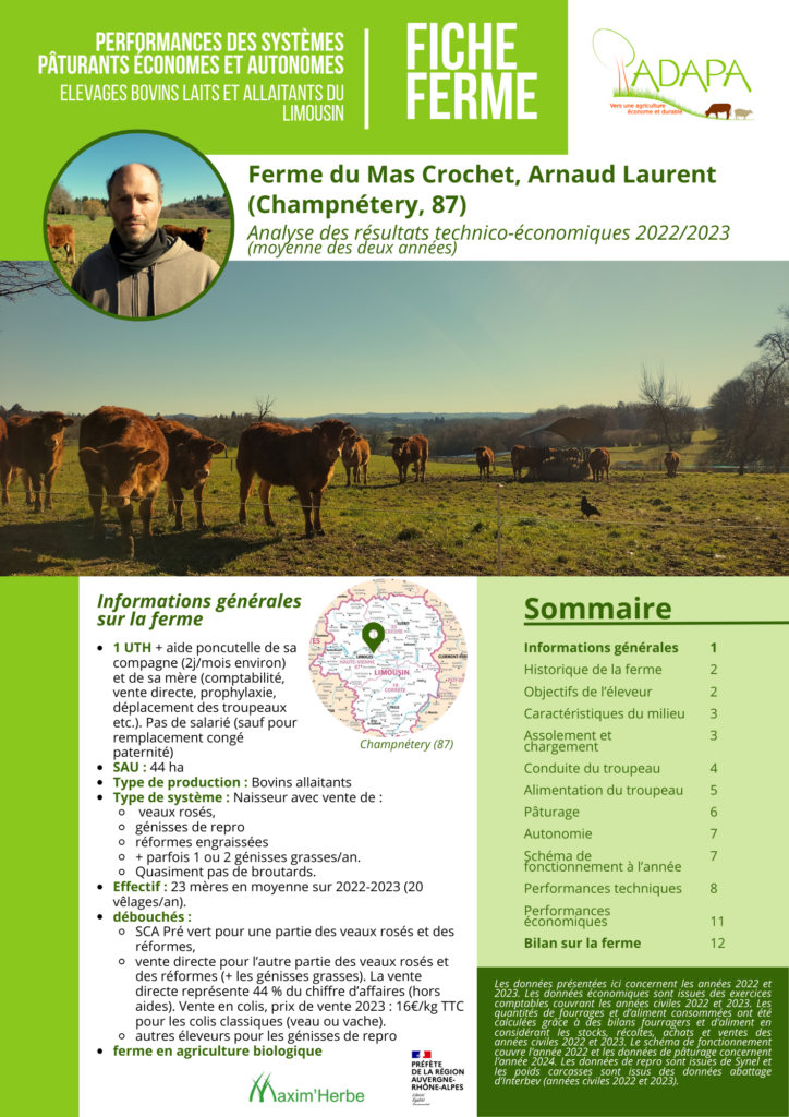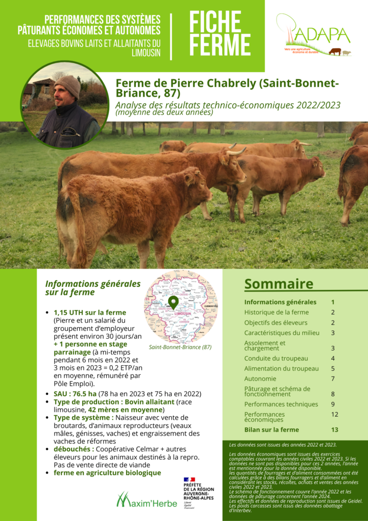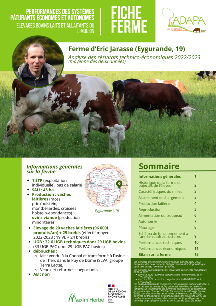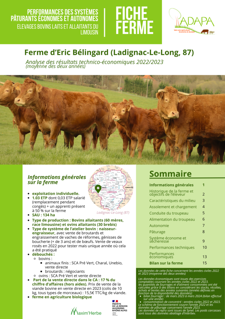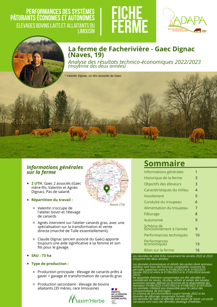 L’objectif pour l’ADAPA est de fournir des données concrètes pour appuyer les projets des personnes qui souhaitent s’installer dans ce genre de systèmes, pour étayer leurs études économiques ou des dossiers bancaires, mais également aiguiller des personnes qui se questionnent sur leurs pratiques et ont besoin de données tangibles avant de mettre en place des changements sur leur ferme. Enfin, ces fiches peuvent être mobilisées par des enseignants qui souhaitent mettre en avant les pratiques d’élevage économes et autonomes en intrants, ou pour enseigner le pâturage tournant en se basant sur des données réelles. Les résultats figurant sur ces fiches de fermes couvrent les années 2022 et 2023 et sont présentés sous la forme d’une moyenne de ces deux années.